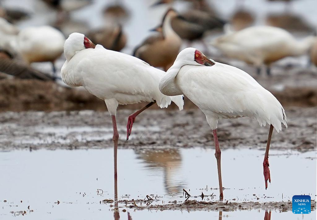 White cranes are pictured at a wetland reserve in Yugan County of Shangrao, east China's Jiangxi Province, Feb. 27, 2026. (Xinhua/Wan Xiang)