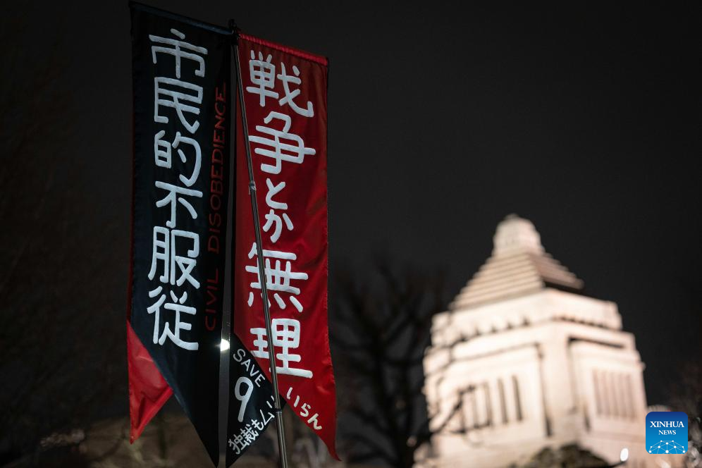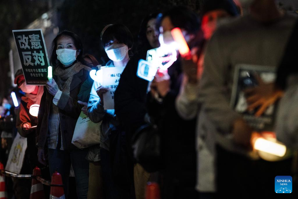 TOKYO, Feb. 28 (Xinhua) -- Large numbers of Japanese citizens gathered on Friday evening in Tokyo to protest Prime Minister Sanae Takaichi's attempt to revise the country's pacifist Constitution.