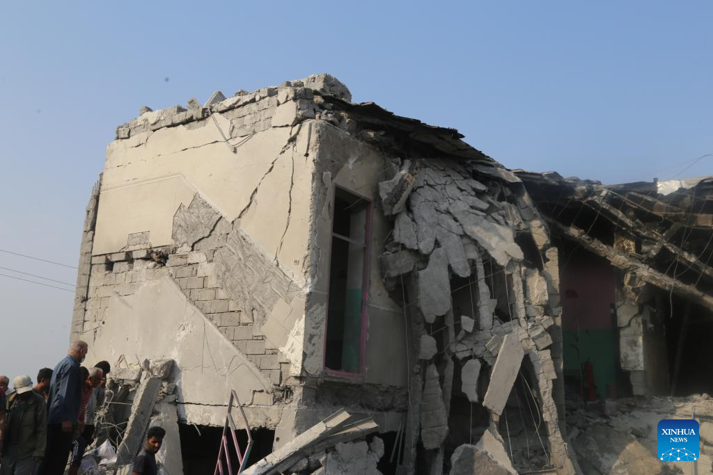 People stand by a damaged building of an attacked girls' elementary school in Minab, Iran's southern province of Hormozgan, Feb. 28, 2026. The death toll from a joint U.S.-Israeli strike on a girls' elementary school in Iran's southern province of Hormozgan rose to 148, semi-official Tasnim news agency reported on Sunday.