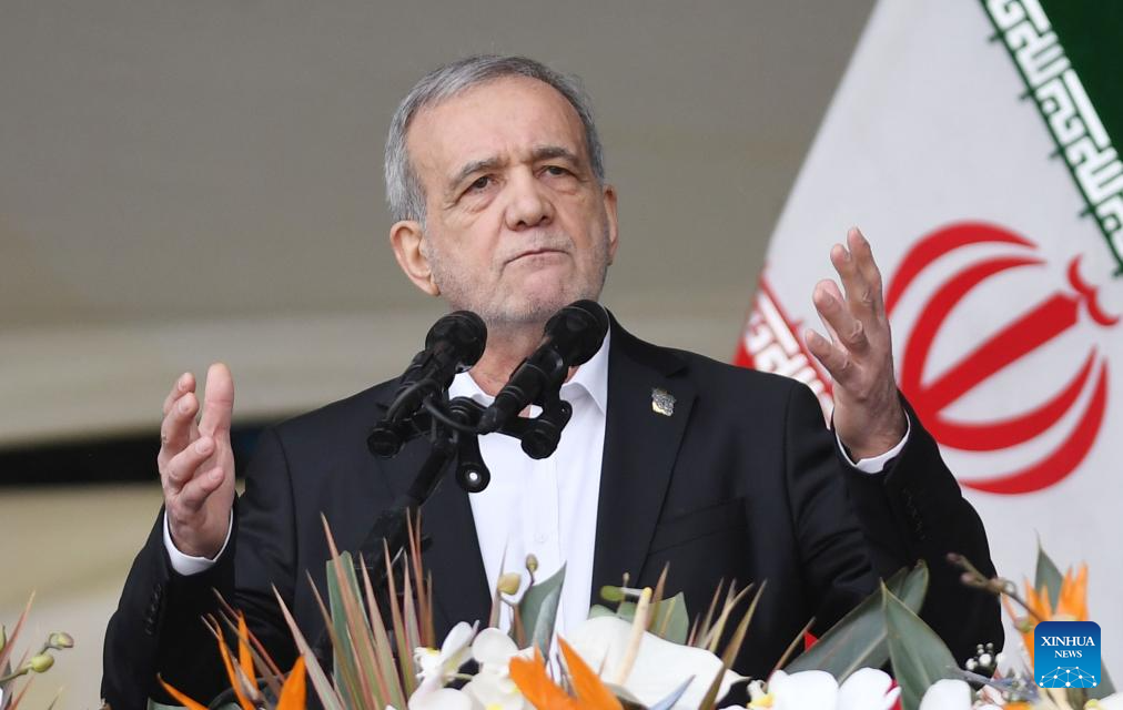 This file photo shows Iranian President Masoud Pezeshkian delivering a speech in Tehran, Iran, Feb. 11, 2026. (Xinhua/Shadati)