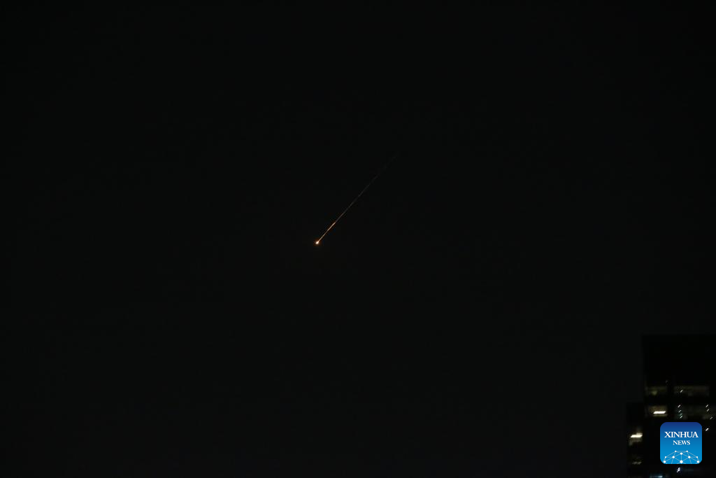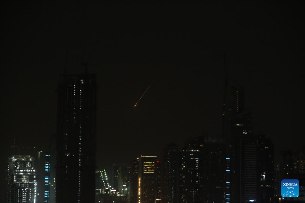 Flares from flying missiles are pictured over Dubai, the United Arab Emirates (UAE), Feb. 28, 2026. UAE said it has intercepted a new wave of Iranian missiles on Saturday. (Xinhua/Wen Xinnian)