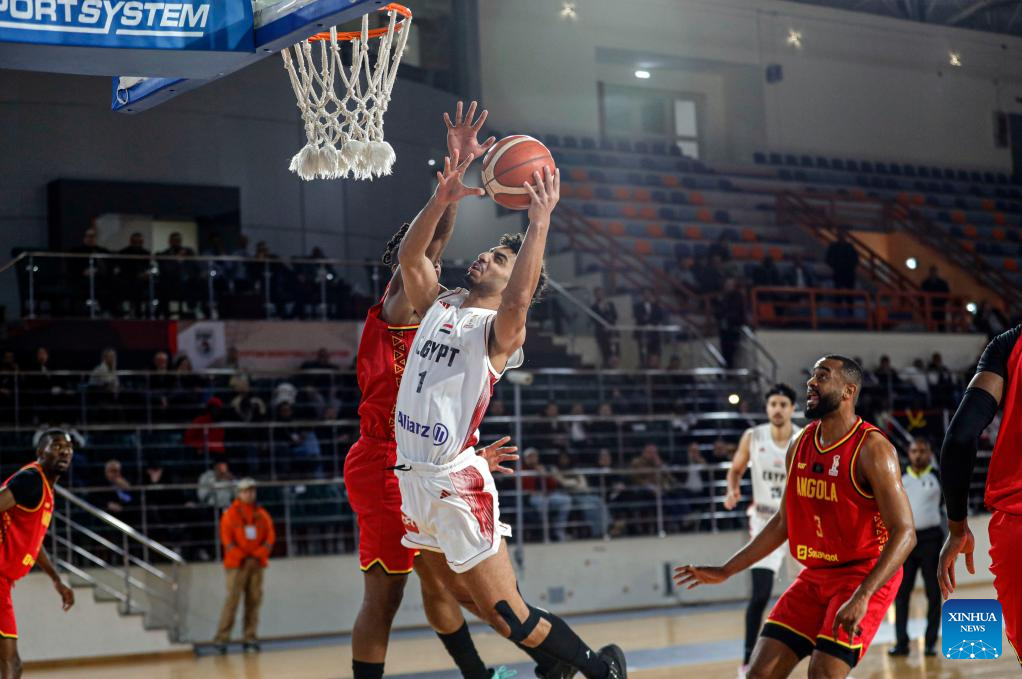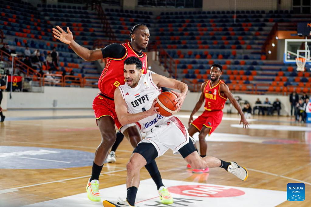 Ehab Amin (front) of Egypt breaks through during the FIBA Basketball World Cup 2027 African Qualifiers Group D match between Egypt and Angola in Alexandria, Egypt, Feb. 28 2026. (Xinhua/Ahmed Gomaa)