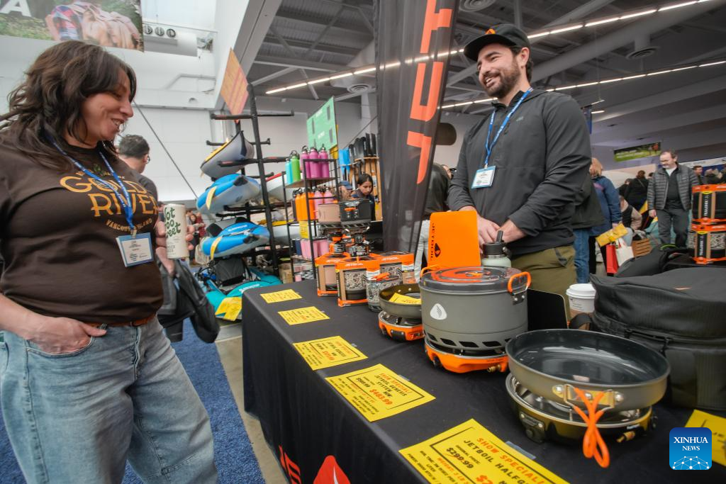 A woman checks out camping cooking gear at the 2026 Outdoor Adventure and Travel Show in Vancouver, British Columbia, Canada, on Feb. 28, 2026. The two-day annual event kicked off Saturday, with over 250 exhibitors showcasing the latest developments in camping gear, paddle sports equipment, outdoor clothing, scuba diving gear, and adventure travel experiences. (Photo by Liang Sen/Xinhua)