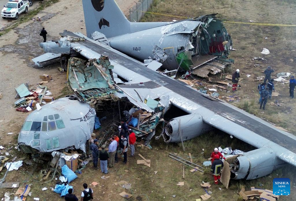 The crash occurred Friday night when a Bolivian Air Force Hercules C-130 military aircraft veered off the runway upon landing at El Alto International Airport and collided with public roads. Dozens were injured and about 20 vehicles, including public transport, were destroyed. (Photo by Javier Mamani/Xinhua)