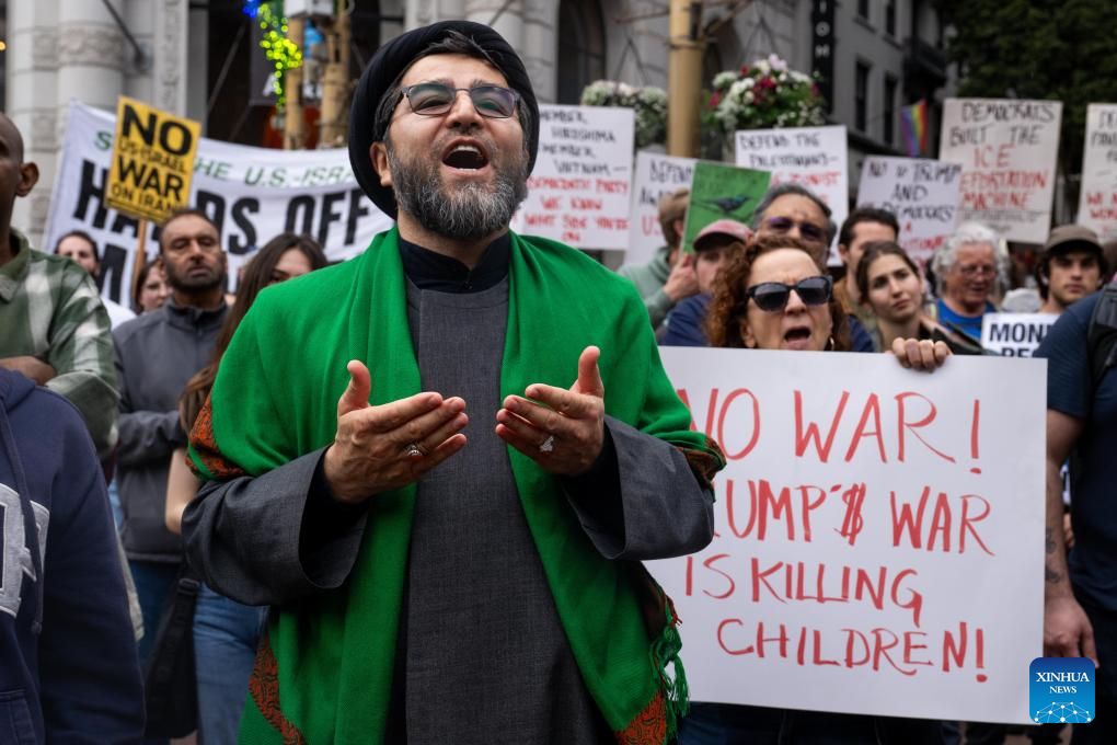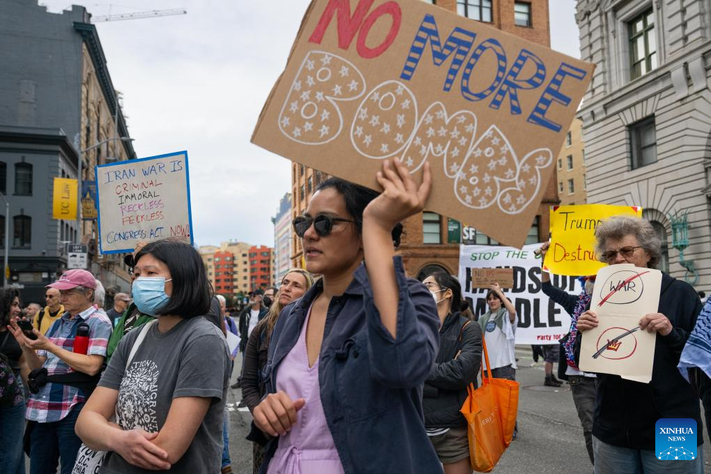 People attend a protest against U.S.-Israeli strikes on Iran in San Francisco, the United States, Feb. 28, 2026. (Photo by Ziyu Julian Zhu/Xinhua)