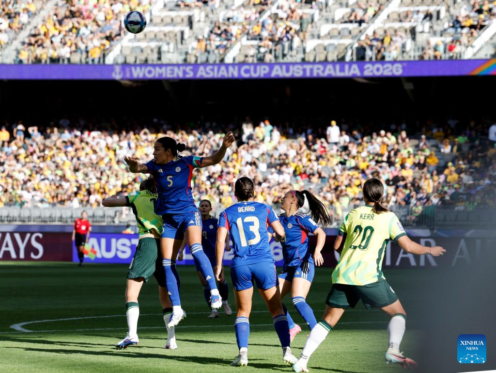 Hali Long (2nd L) of the Philippines vies for a header during the group A opener match between Australia and the Philippines at the 2026 AFC Women's Asian Cup at Perth Stadium in Perth, Australia, March 1, 2026. (Xinhua/Ma Ping)