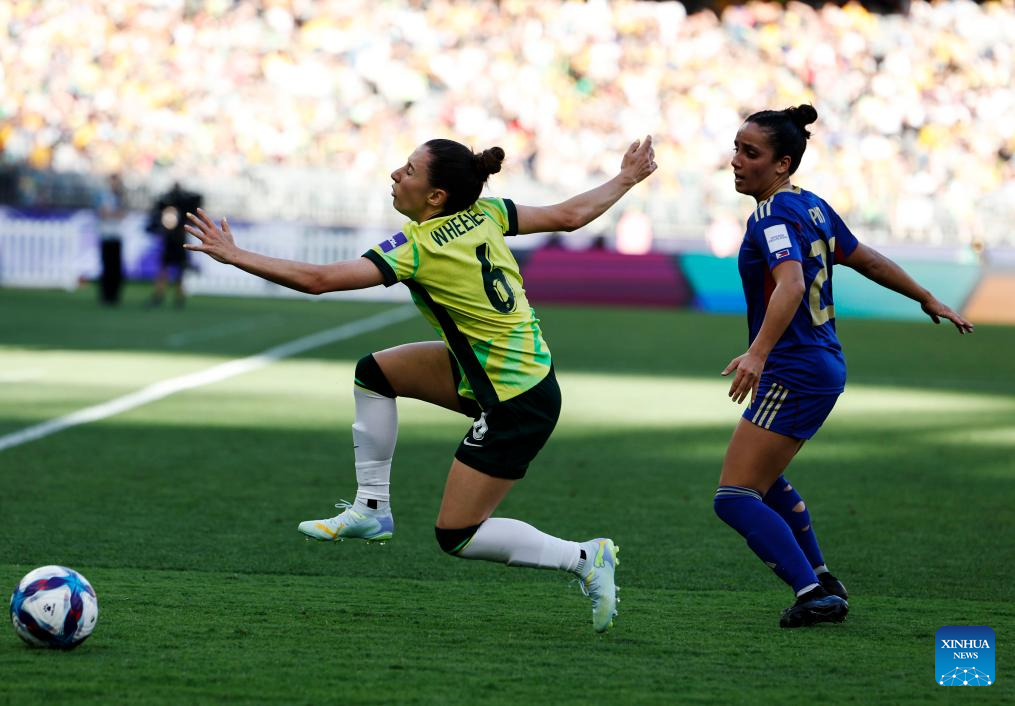 Clare Wheeler (L) of Australia competes during the group A opener match between Australia and the Philippines at the 2026 AFC Women's Asian Cup at Perth Stadium in Perth, Australia, March 1, 2026. (Xinhua/Ma Ping)