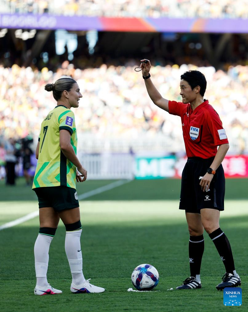Stephanie Catley (L) of Australia talks with referee Dong Fangyu during the group A opener match between Australia and the Philippines at the 2026 AFC Women's Asian Cup at Perth Stadium in Perth, Australia, March 1, 2026. (Xinhua/Ma Ping)