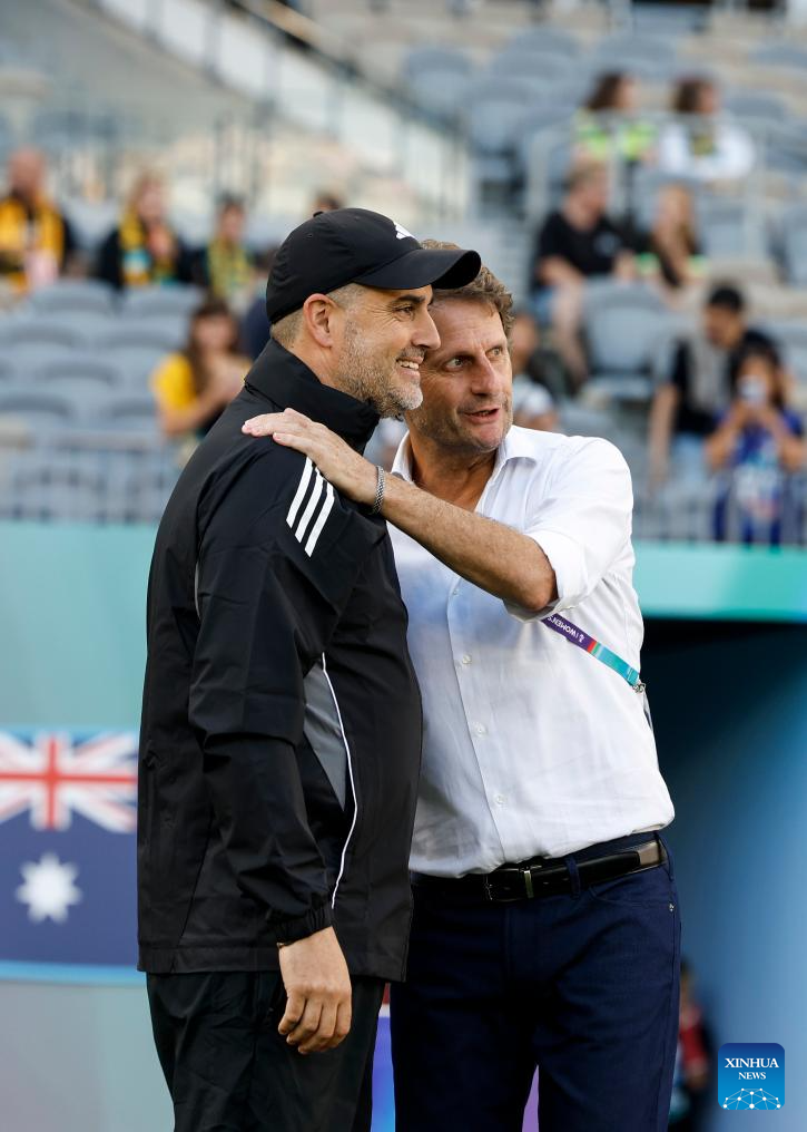 Joseph Montemurro (R), head coach of Australia, talks with Mark Torcaso, head coach of the Philippines, before the group A opener match between Australia and the Philippines at the 2026 AFC Women's Asian Cup at Perth Stadium in Perth, Australia, March 1, 2026. (Xinhua/Ma Ping)