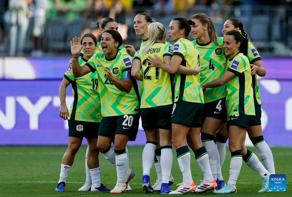 Samantha Kerr (2nd L) of Australia celebrates scoring with teammates during the group A opener match between Australia and the Philippines at the 2026 AFC Women's Asian Cup at Perth Stadium in Perth, Australia, March 1, 2026. (Xinhua/Ma Ping)