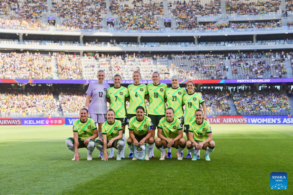 Starting players of Australia line up before the group A opener match between Australia and the Philippines at the 2026 AFC Women's Asian Cup at Perth Stadium in Perth, Australia, March 1, 2026. (Photo by Zhou Dan/Xinhua)