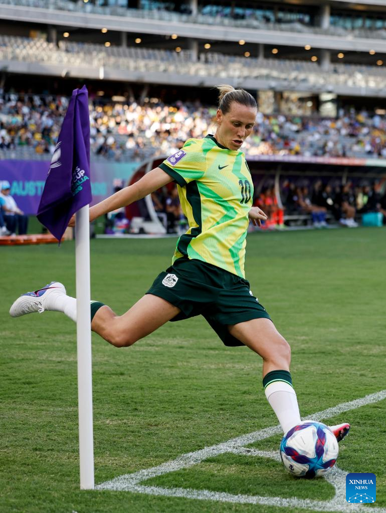 Emily Van Egmond of Australia takes a corner kick during the group A opener match between Australia and the Philippines at the 2026 AFC Women's Asian Cup at Perth Stadium in Perth, Australia, March 1, 2026. (Xinhua/Ma Ping)