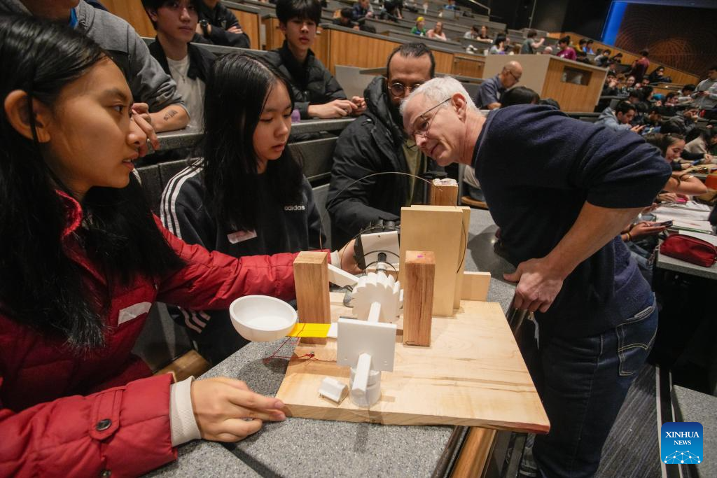 Students look at their projectile launcher in action during the 48th annual Physics Olympics at the University of British Columbia in Vancouver, British Columbia, Canada, on Feb. 28, 2026. More than 1,000 high school students from across the Canadian province of British Columbia participated in the 48th annual Physics Olympics held here on Saturday. (Photo by Liang Sen/Xinhua)