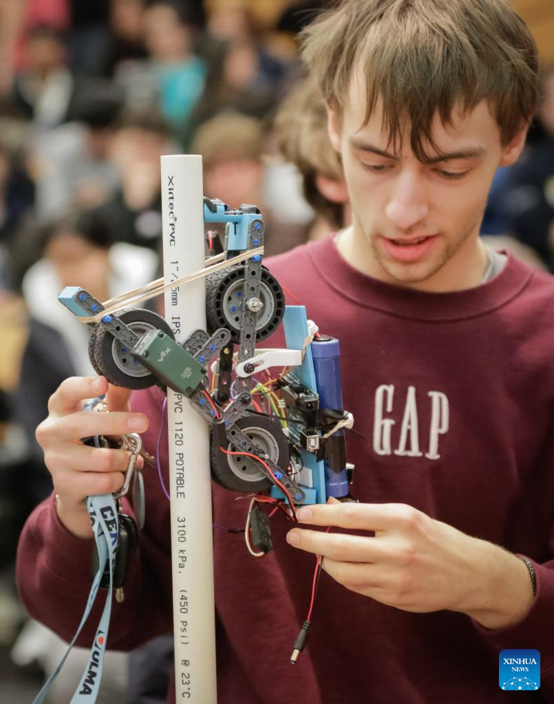 A student fine-tunes a robotic pole climber during the 48th annual Physics Olympics at the University of British Columbia in Vancouver, British Columbia, Canada, on Feb. 28, 2026. More than 1,000 high school students from across the Canadian province of British Columbia participated in the 48th annual Physics Olympics held here on Saturday. (Photo by Liang Sen/Xinhua)