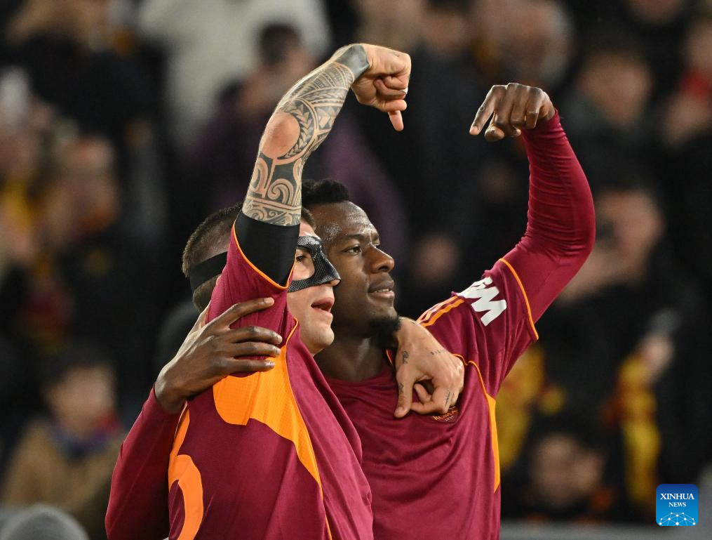Roma's Evan Ndicka (R) celebrates his goal with his teammate Gianluca Mancini during an Italian Serie A football match between Roma and Juventus in Rome, Italy, March 1, 2026. (Photo by Alberto Lingria/Xinhua)