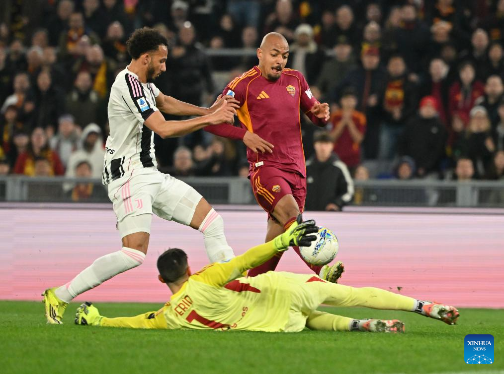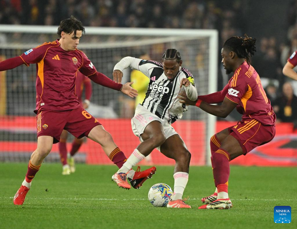 Juventus' Jonathan David (C) vies with Roma's Niccolo Pisilli (L) and Manu Kone during an Italian Serie A football match between Roma and Juventus in Rome, Italy, March 1, 2026. (Photo by Alberto Lingria/Xinhua)
