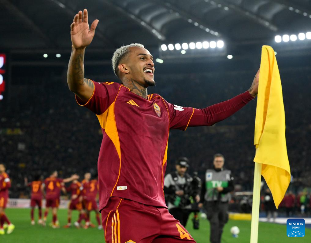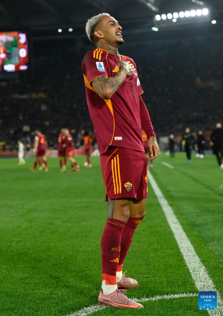 Roma's Wesley Franca celebrates his goal during an Italian Serie A football match between Roma and Juventus in Rome, Italy, March 1, 2026. (Photo by Alberto Lingria/Xinhua)