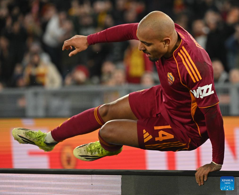 Roma's Donyell Malen celebrates his goal during an Italian Serie A football match between Roma and Juventus in Rome, Italy, March 1, 2026. (Photo by Alberto Lingria/Xinhua)