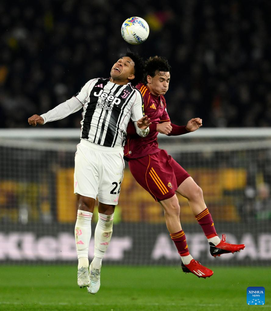 Juventus' Weston Mckennie (L) vies with Roma's Niccolo Pisilli during an Italian Serie A football match between Roma and Juventus in Rome, Italy, March 1, 2026. (Photo by Alberto Lingria/Xinhua)