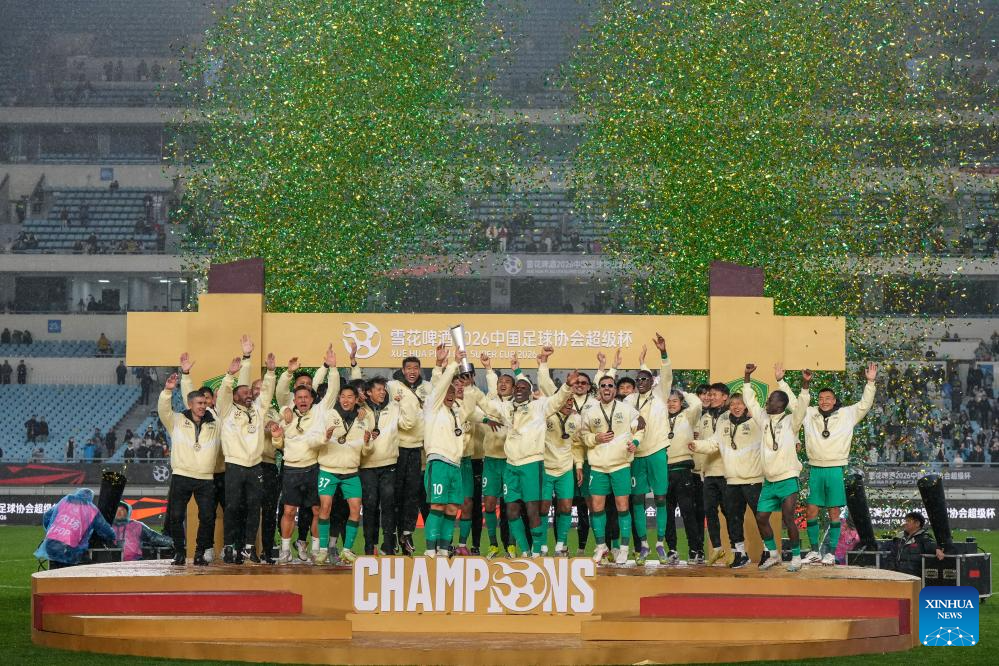 Team members of Beijing Guoan celebrate during the awarding ceremony for CFA Super Cup 2026 in Nanjing, east China's Jiangsu Province, March 1, 2026. (Xinhua/Li Bo)