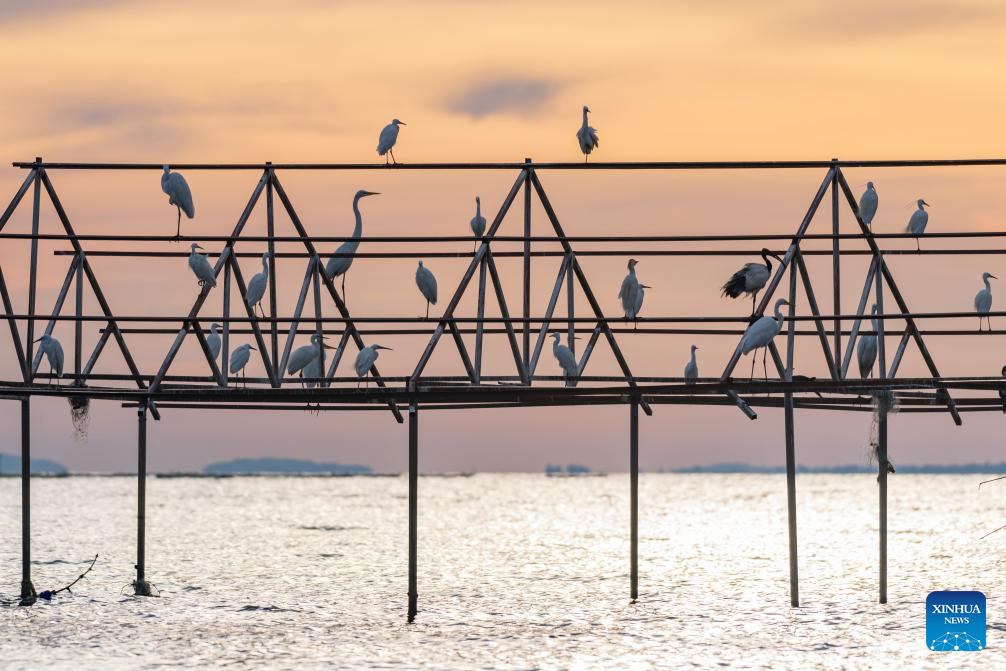 Birds rest on a rack at Lake Victoria, in Kisumu, Kenya, Feb. 27, 2026.