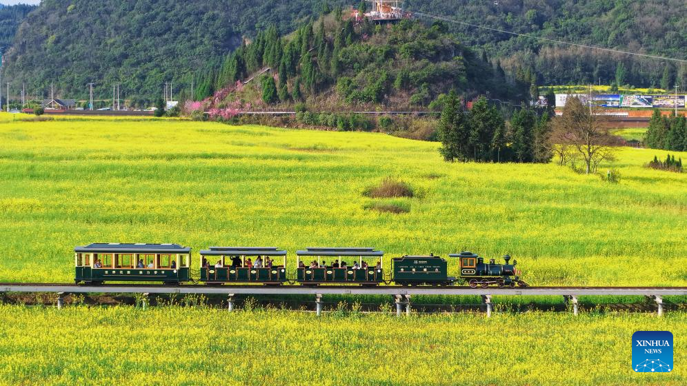 A drone photo shows people touring a rapeseed flower field by train in Luoping County, southwest China's Yunnan Province, Feb. 27, 2026. (Photo by Yang Zixuan/Xinhua)