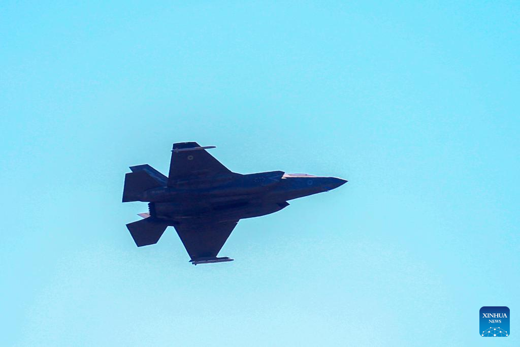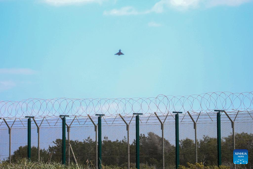 A military fighter aircraft is seen over the RAF (Royal Air Force) base in Akrotiri, Cyprus, on March 2, 2026. The British air base at Akrotiri on the southern coast of Cyprus was hit by a drone early Monday, base authorities and the Cypriot government said. (Photo by George Christophorou/Xinhua)