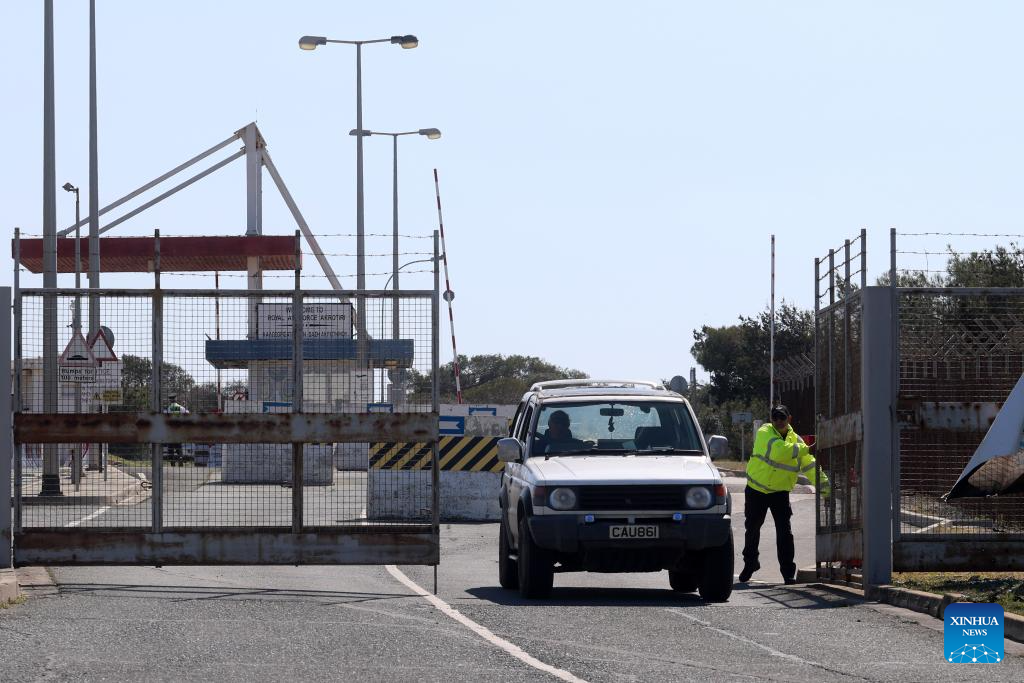 A vehicle leaves the RAF (Royal Air Force) base in Akrotiri, Cyprus, on March 2, 2026. The British air base at Akrotiri on the southern coast of Cyprus was hit by a drone early Monday, base authorities and the Cypriot government said. (Photo by George Christophorou/Xinhua)