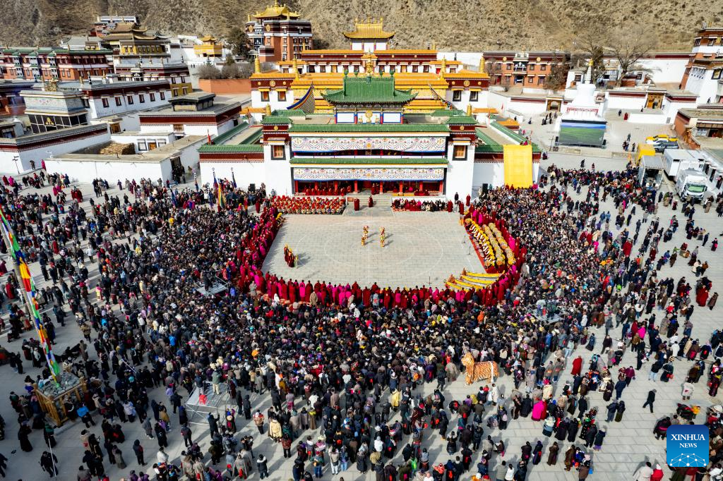 An aerial drone photo taken on March 2, 2026 shows an event of exorcism dance at the Labrang Monastery in Xiahe County, northwest China's Gansu Province. The annual event of exorcism dance to pray for good luck in the new year was held here on Monday. Built in 1709, Labrang Monastery is one of the six great monasteries of the Gelug Sect of Tibetan Buddhism. (Xinhua/Liu Keying)