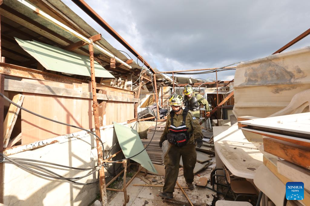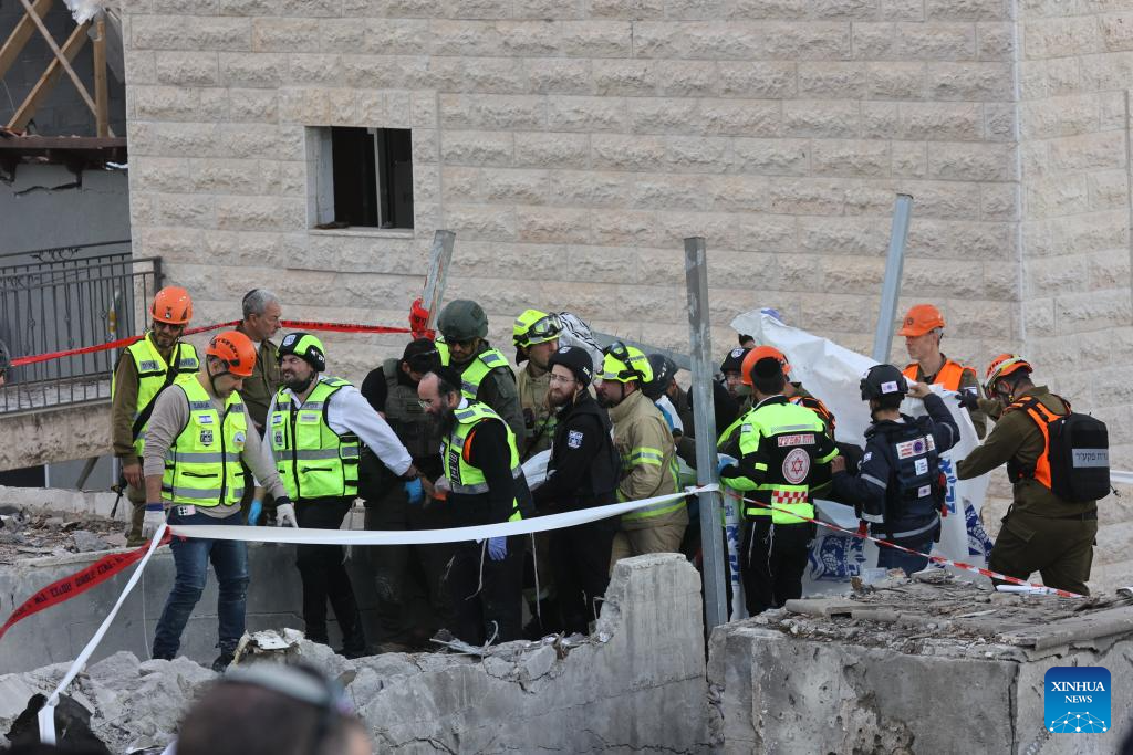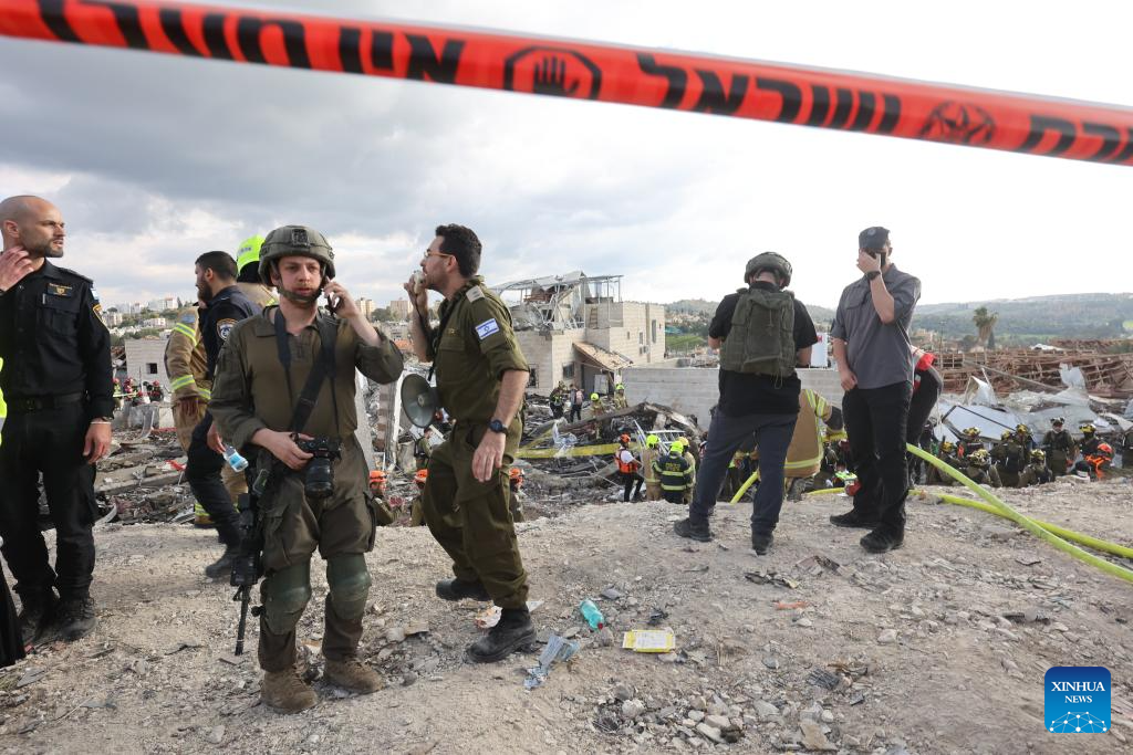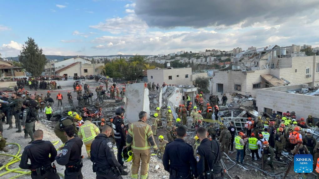 This photo taken on March 1, 2026 shows the site of a missile strike in Beit Shemesh, west of Jerusalem. Eight people were killed and at least 23 were injured on Sunday when an Iranian missile struck a residential area in Beit Shemesh, west of Jerusalem, according to local media reports. (Photo by Gil Cohen Magen/Xinhua)