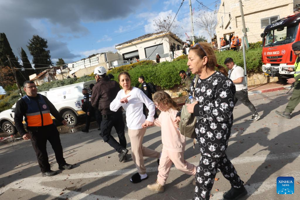 Residents evacuate from the site of a missile strike in Beit Shemesh, west of Jerusalem, March 1, 2026. Eight people were killed and at least 23 were injured on Sunday when an Iranian missile struck a residential area in Beit Shemesh, west of Jerusalem, according to local media reports. (Photo by Gil Cohen Magen/Xinhua)