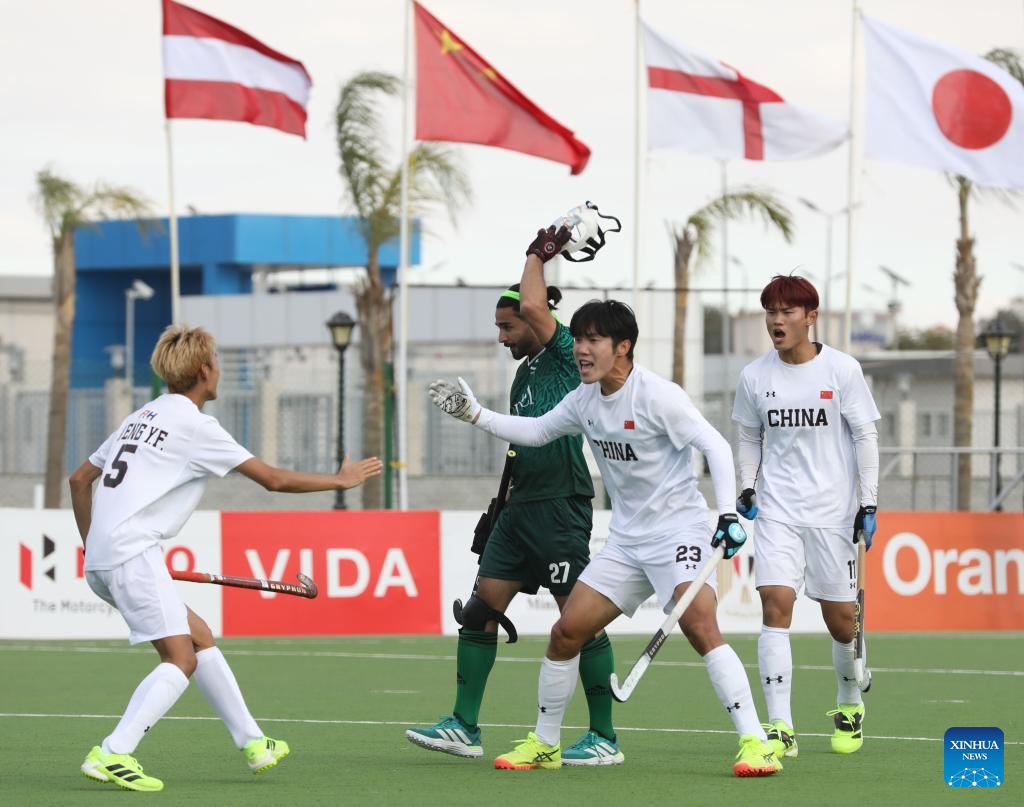 Du Shihao (2nd R) of China celebrates scoring with his teammates during the FIH Hockey Men's World Cup 2026 Qualifiers match between China and Pakistan in Ismailia, Egypt, March 1, 2026. (Xinhua/Ahmed Gomaa)