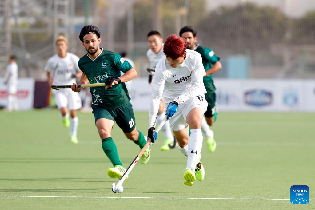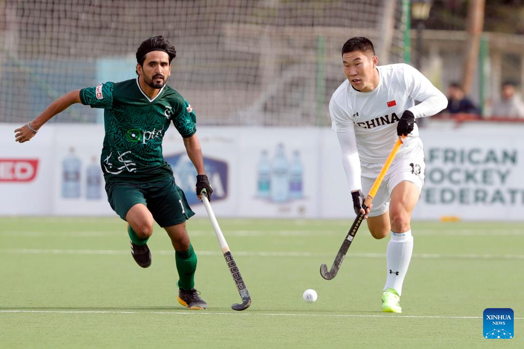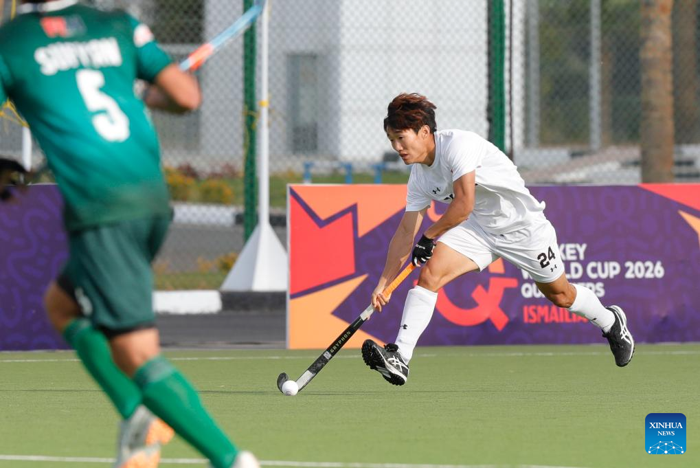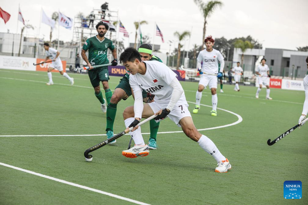 Li Pengfei (R) of China controls the ball during the FIH Hockey Men's World Cup 2026 Qualifiers match between China and Pakistan in Ismailia, Egypt, March 1, 2026. (Xinhua/Ahmed Gomaa)