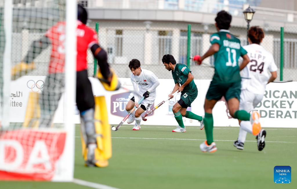 Wang Yaqi (L, rear) of China breaks through during the FIH Hockey Men's World Cup 2026 Qualifiers match between China and Pakistan in Ismailia, Egypt, March 1, 2026. (Xinhua/Ahmed Gomaa)