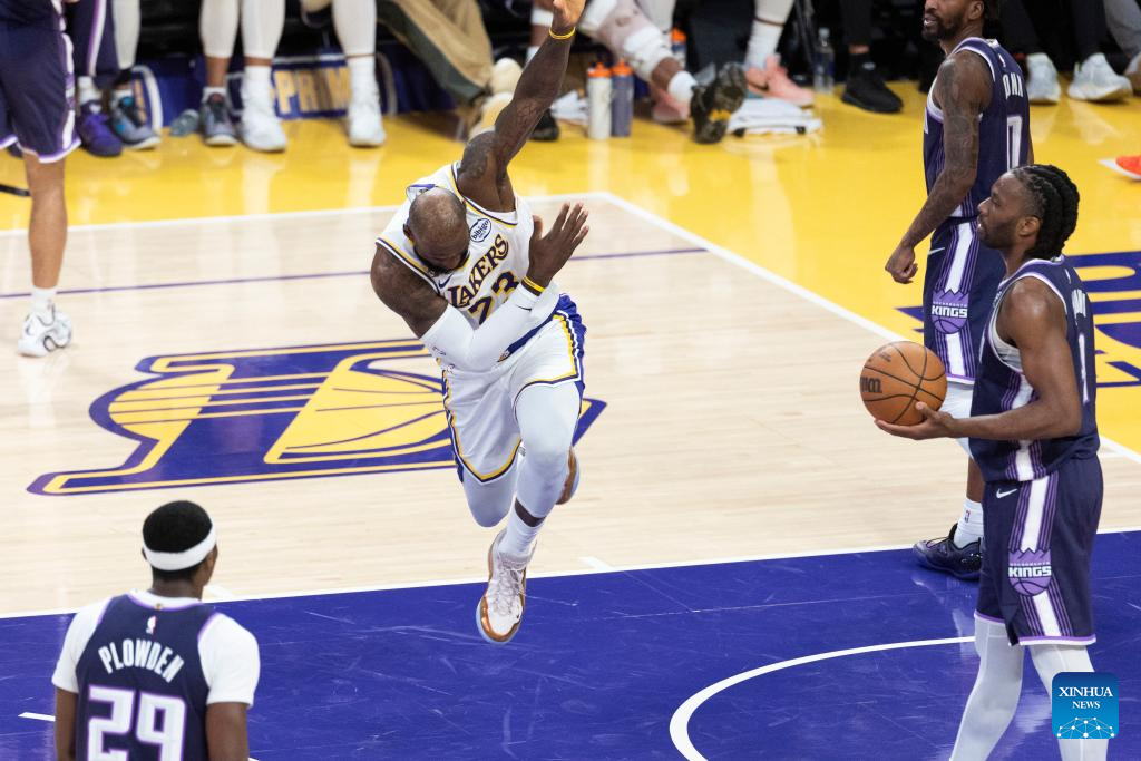 Los Angeles Lakers' LeBron James (C) celebrates after scoring during the 2025-2026 NBA regular season basketball game between Los Angeles Lakers and Sacramento Kings in Los Angeles, the United States, March 1, 2026. (Photo by Ringo Chiu/Xinhua)