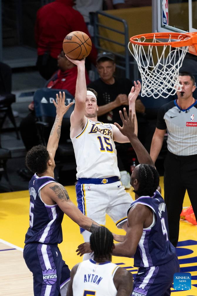Los Angeles Lakers' Austin Reaves (Above) shoots during the 2025-2026 NBA regular season basketball game between Los Angeles Lakers and Sacramento Kings in Los Angeles, the United States, March 1, 2026. (Photo by Ringo Chiu/Xinhua)
