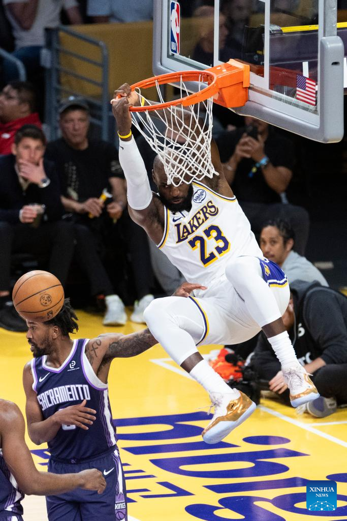 Los Angeles Lakers' LeBron James (R) dunks during the 2025-2026 NBA regular season basketball game between Los Angeles Lakers and Sacramento Kings in Los Angeles, the United States, March 1, 2026. (Photo by Ringo Chiu/Xinhua)