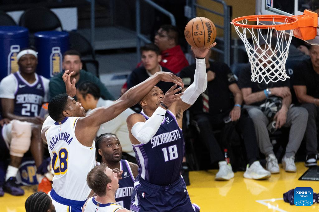 Los Angeles Lakers' Russell Westbrook (R) shoots during the 2025-2026 NBA regular season basketball game between Los Angeles Lakers and Sacramento Kings in Los Angeles, the United States, March 1, 2026. (Photo by Ringo Chiu/Xinhua)