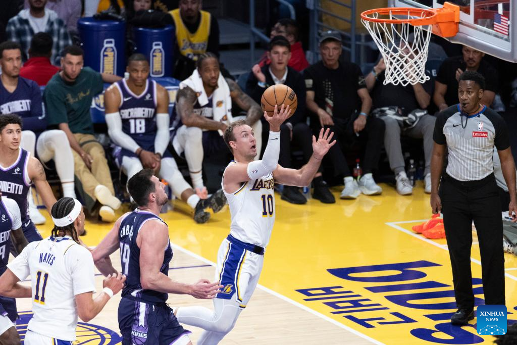 Los Angeles Lakers' Luke Kennard (R, front) goes to the basket during the 2025-2026 NBA regular season basketball game between Los Angeles Lakers and Sacramento Kings in Los Angeles, the United States, March 1, 2026. (Photo by Ringo Chiu/Xinhua)
