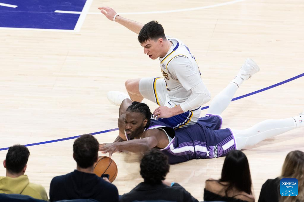 Los Angeles Lakers' Jake LaRavia (top) and Sacramento Kings' Precious Achiuwa vie for the ball during the 2025-2026 NBA regular season basketball game between Los Angeles Lakers and Sacramento Kings in Los Angeles, the United States, March 1, 2026. (Photo by Ringo Chiu/Xinhua)