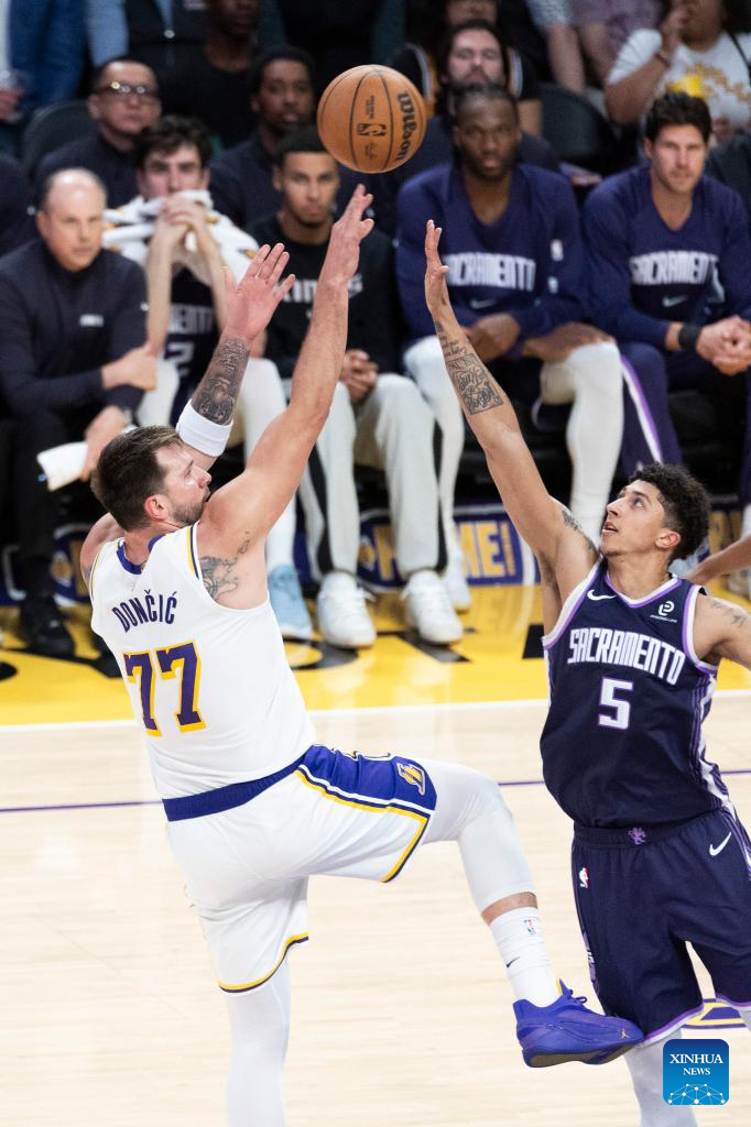Los Angeles Lakers' Luka Doncic (L) shoots against Sacramento Kings' Nique Clifford during the 2025-2026 NBA regular season basketball game between Los Angeles Lakers and Sacramento Kings in Los Angeles, the United States, March 1, 2026. (Photo by Ringo Chiu/Xinhua)
