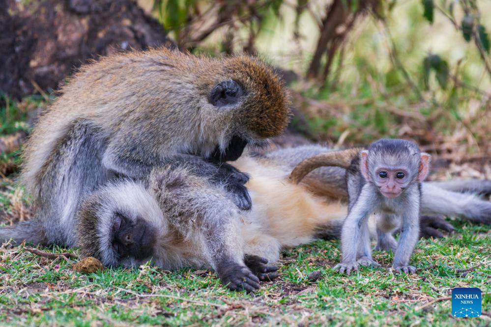 This photo taken on Feb. 1, 2026 shows monkeys on the Crescent Island in Lake Naivasha in Nakuru County, Kenya.