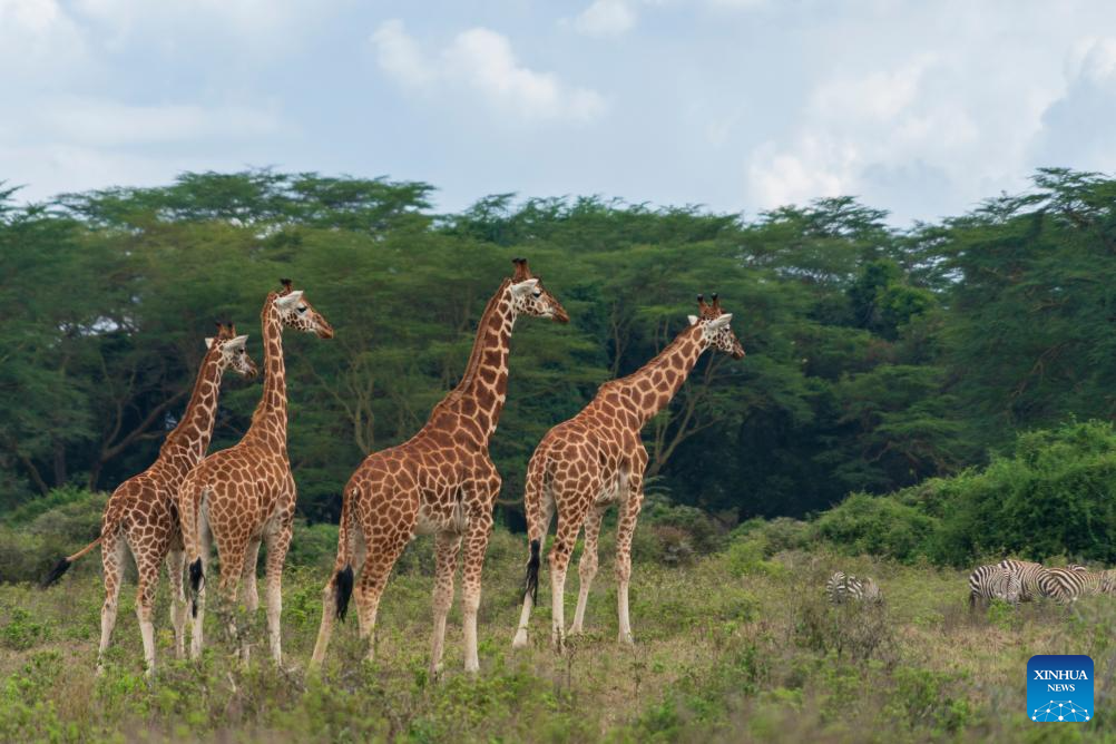 This photo taken on March 2, 2026 shows a herd of giraffes at the Lake Nakuru National Park in Nakuru County, Kenya.