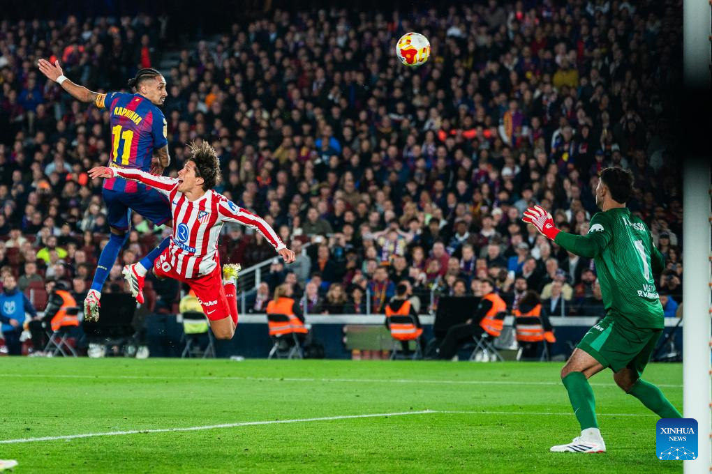 Raphinha of FC Barcelona (L) vies for a header with Giuliano Simeone of Atletico de Madrid during the Copa del Rey semifinal round 2 match between FC Barcelona and Atletico de Madrid in Barcelona, Spain, March 3, 2026. (Photo by Joan Gosa/Xinhua)