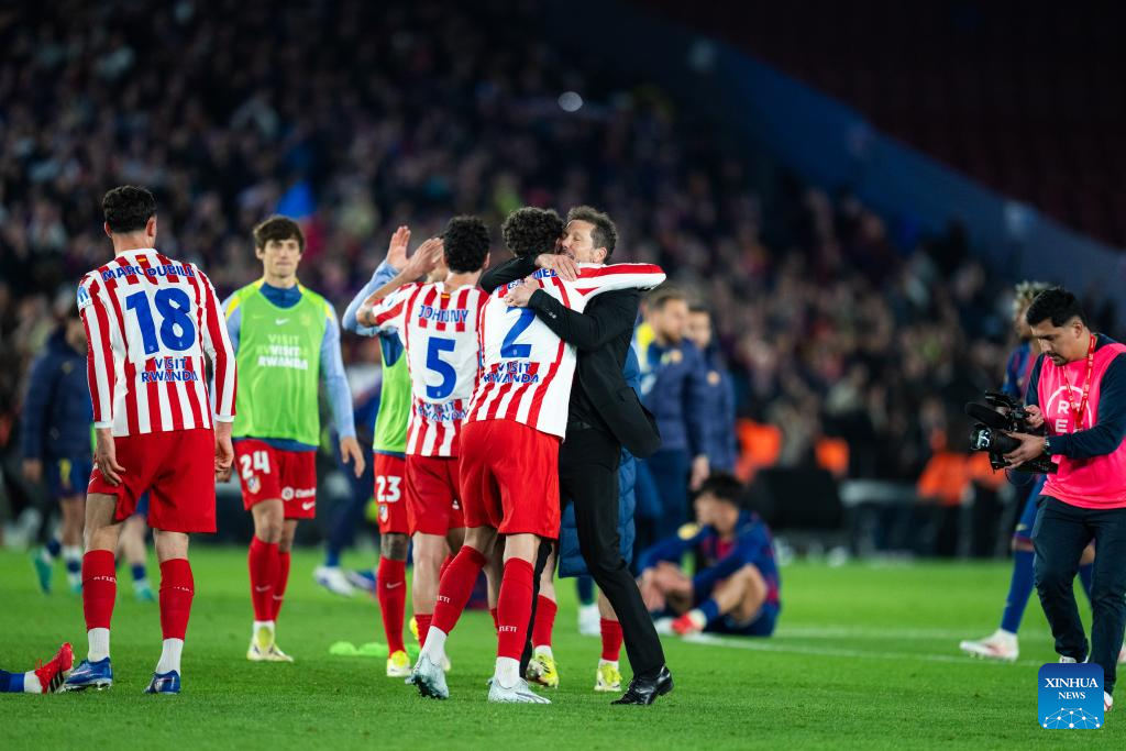 Players of Atletico de Madrid celebrate after the Copa del Rey semifinal round 2 match between FC Barcelona and Atletico de Madrid in Barcelona, Spain, March 3, 2026. (Photo by Joan Gosa/Xinhua)