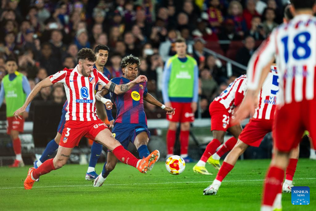 Lamine Yamal (R) of FC Barcelona vies with Matteo Ruggeri of Atletico de Madrid during the Copa del Rey semifinal round 2 match between FC Barcelona and Atletico de Madrid in Barcelona, Spain, March 3, 2026. (Photo by Joan Gosa/Xinhua)