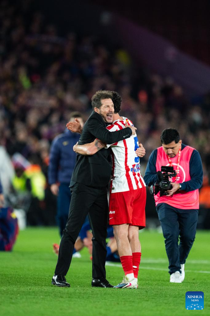 Diego Pablo Simeone (L) head coach of Atlético de Madrid celebrates with Johnny Cardoso after the Copa del Rey semifinal round 2 match between FC Barcelona and Atletico de Madrid in Barcelona, Spain, March 3, 2026. (Photo by Joan Gosa/Xinhua)