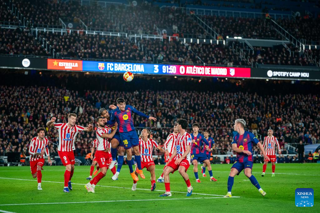 Gerard Martin (top) of FC Barcelona vies for a header during the Copa del Rey semifinal round 2 match between FC Barcelona and Atletico de Madrid in Barcelona, Spain, March 3, 2026. (Photo by Joan Gosa/Xinhua)