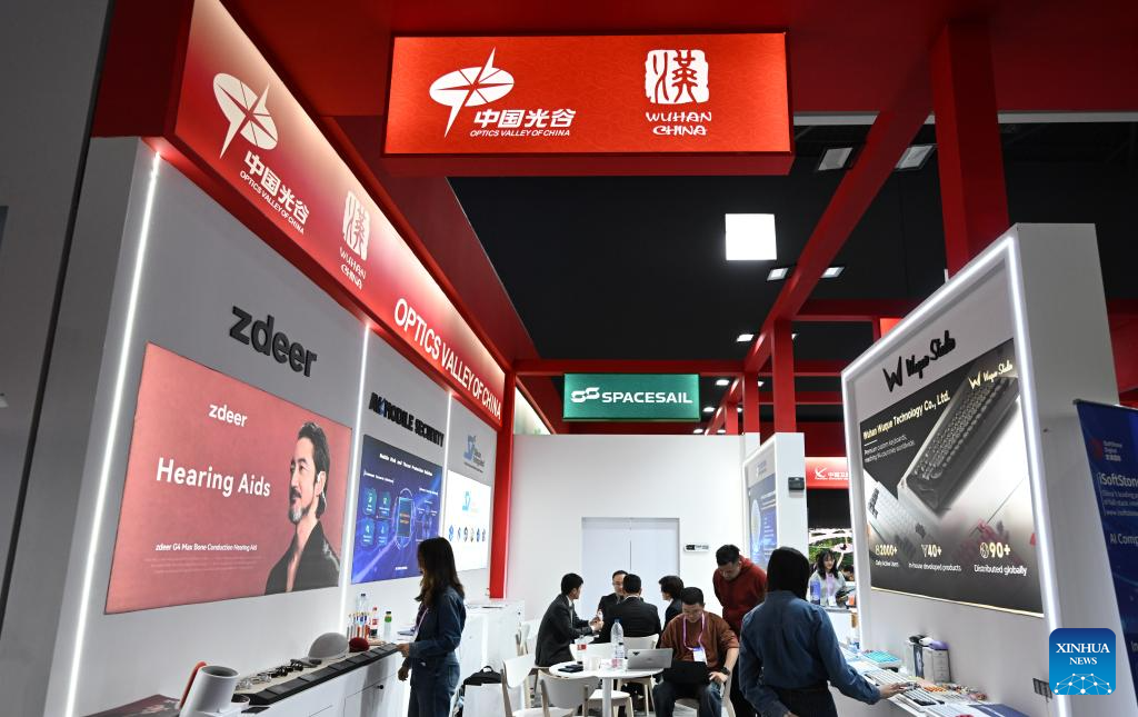 People visit the booth of Optics Valley of China during the 2026 Mobile World Congress in Barcelona, Spain, March 3, 2026. The 2026 Mobile World Congress (MWC) opened on Monday in Barcelona, Spain. According to its organizers, a China Pavilion has been set up at the congress for the first time, featuring major Chinese companies including China Mobile, China Unicom, Huawei, ZTE, Honor and Xiaomi, showcasing their latest advancements in mobile communications and AI technologies. (Xinhua/Cheng Min)