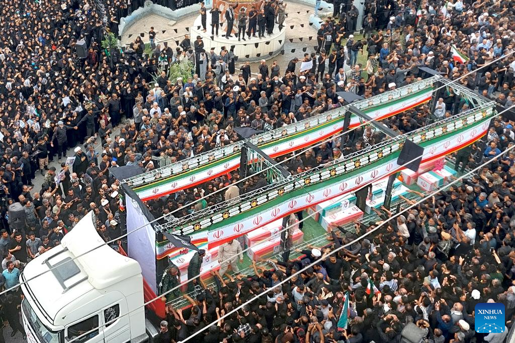 People take part in a mass funeral ceremony for students and staff members killed in a United States-Israeli attack on a school in Minab, Iran's southern province of Hormozgan, March 3, 2026. The school was bombed in Israeli and U.S. strikes, leaving at least 165 people killed and 95 others wounded on Saturday. (Mehr News Agency/Handout via Xinhua)